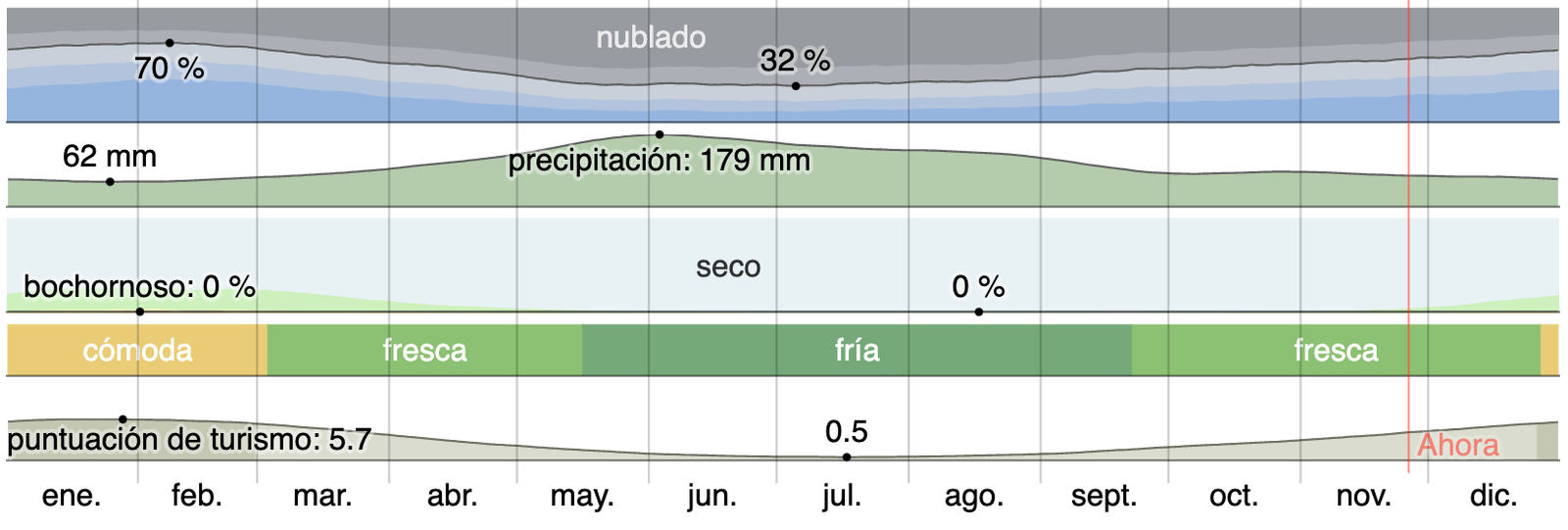 En base a la puntuación de turismo, la mejor época del año para visitar esta ruta patagónica para actividades de tiempo caluroso es desde finales de diciembre hasta finales de febrero.