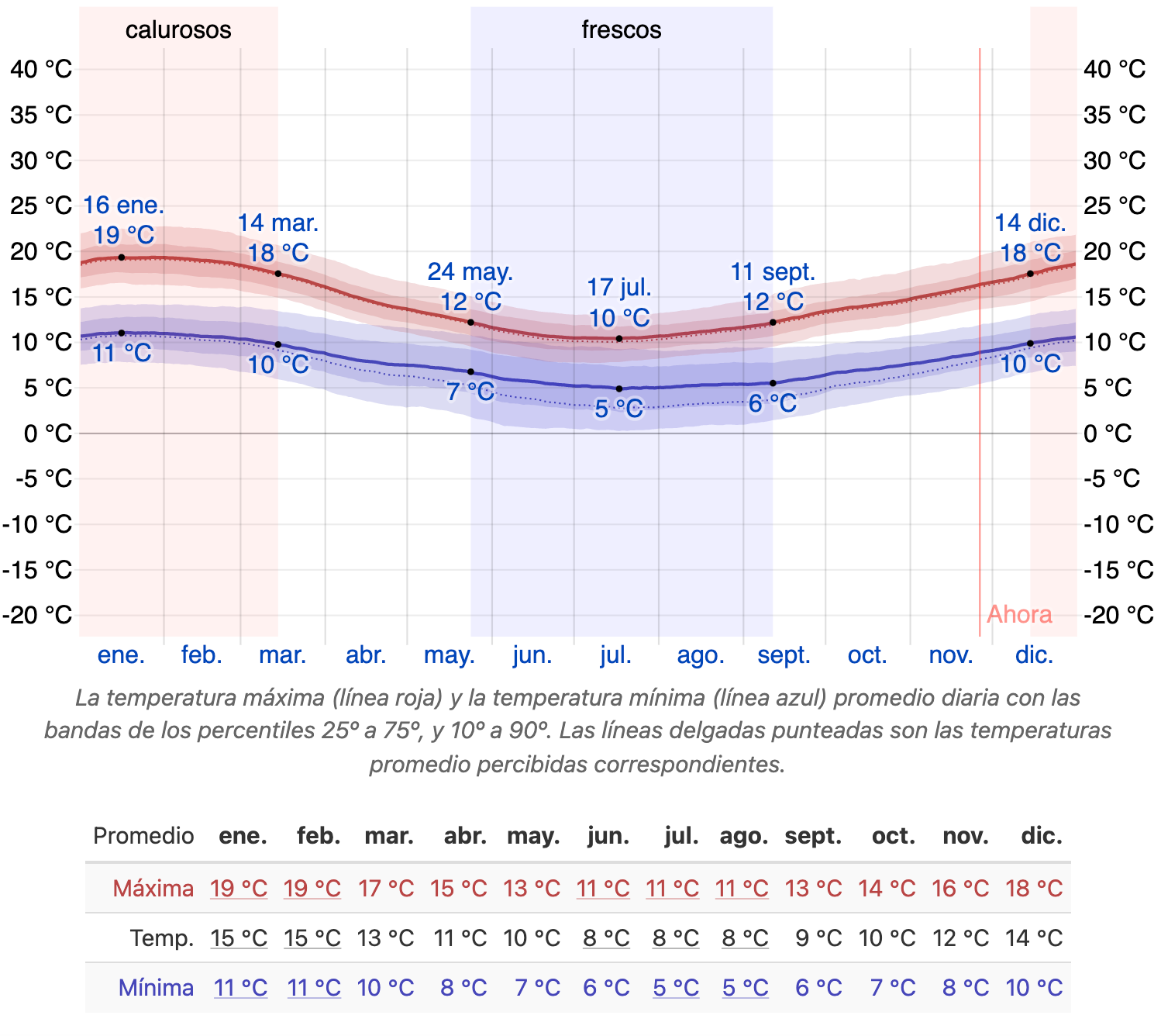 La temporada fresca dura 3,6 meses, del 24 de mayo al 11 de septiembre, y la temperatura máxima promedio diaria es menos de 12 °C. El mes más frío del año en esta ruta patagónica es julio, con una temperatura mínima promedio de 5 °C y máxima de 11 °C.