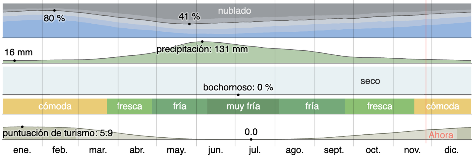 En base a la puntuación de turismo, la mejor época del año para visitar esta ruta patagónica para actividades de tiempo caluroso es desde mediados de diciembre hasta finales de febrero.