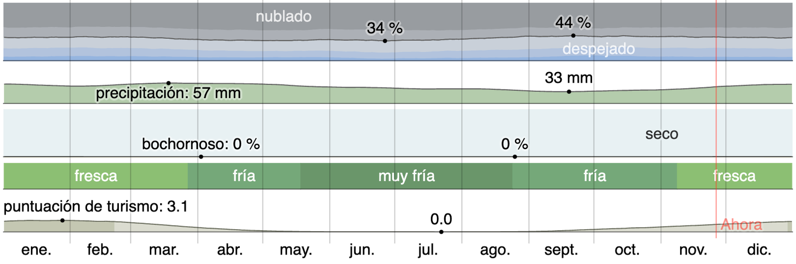 En base a la puntuación de turismo, la mejor época del año para visitar esta ruta patagónica para actividades de tiempo caluroso es desde finales de diciembre hasta finales de febrero.