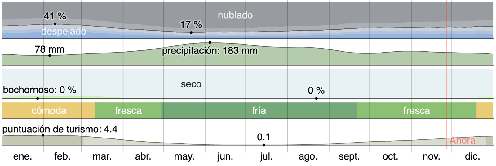 En base a la puntuación de turismo, la mejor época del año para visitar esta ruta patagónica para actividades de tiempo caluroso es desde finales de diciembre hasta principios de marzo.